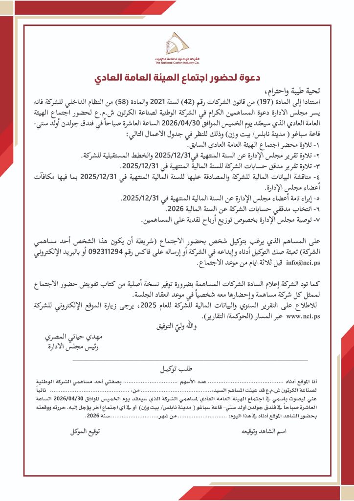الشركة الوطنيه لصناعة الكرتون (NCI) تفصح عن تقريرها السنوي للسنة المالية 2025